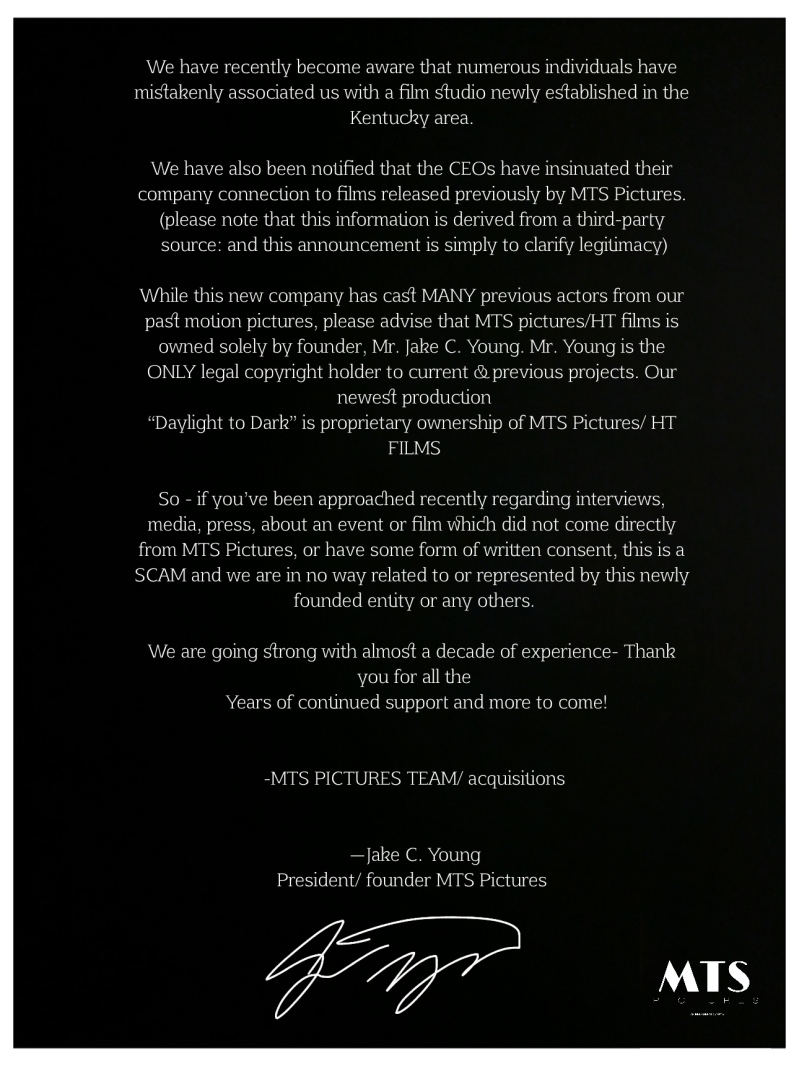 The post was an official document released to the MTS Pictures Facebook page and signed by President Jake C. Young endorsing the publication. Young stated "My team and I have worked very hard for almost 10 years to make sure we are successful in this business. So we want to make sure people know when we're a part of something and when we are not."